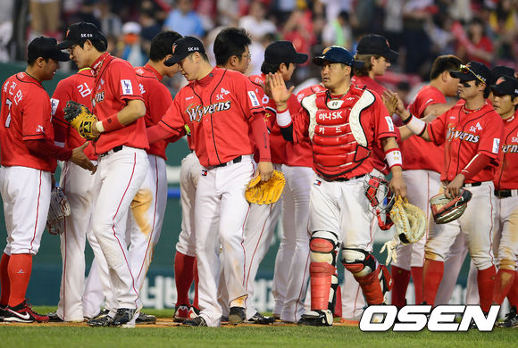 경기후 SK 선수들이 승리 하이파이브를 하고 있다./jpnews@osen.co.kr