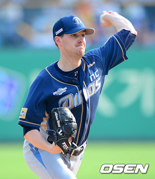 25일 오후 광주 무등야구장에서 열린 '2013 한국야쿠르트 세븐 프로야구' KIA 타이거즈와 NC 다이노스의 경기, 1회말 NC 선발 투수 아담이 힘차게 공을 던지고 있다.