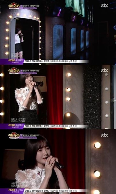 강민경은 25일 오후 방송된 ‘히든싱어’에 출연, 윤민수를 비롯해 윤민수모창능력자들과 함께 ‘그 남자 그 여자’를 열창했다.