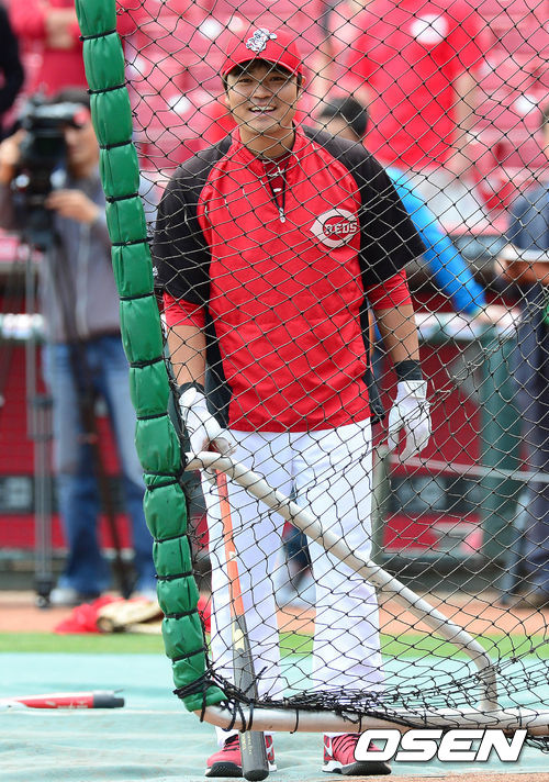 26일 새벽(이하 한국시간) 미국 오하이오주 신시내티 그레이트 아메리칸 볼파크에서 열리는 신시내티 레즈와 시카고 컵스의 경기 시작 전 추신수가 훈련 중 미소를 짓고 있다.
