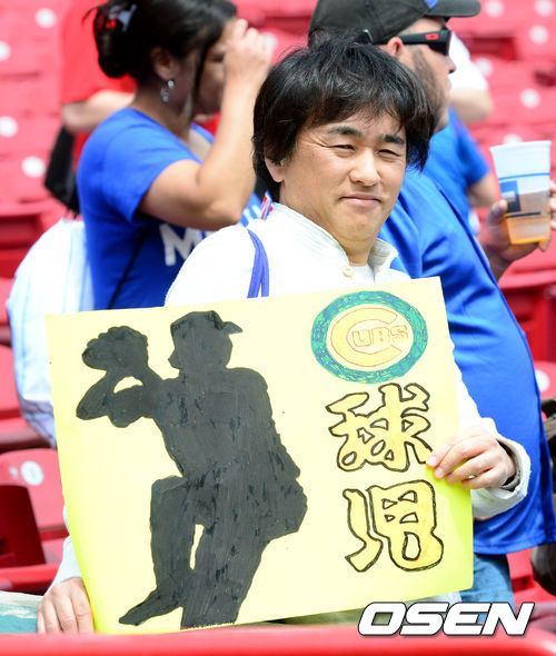 26일 새벽(이하 한국시간) 미국 오하이오주 신시내티 그레이트 아메리칸 볼파크에서 열리는 신시내티 레즈와 시카고 컵스의 경기 시작 전 한 일본팬이 후지카와의 이름이 적힌 응원 카드를 들고 관중석에서 포즈를 취하고 있다.