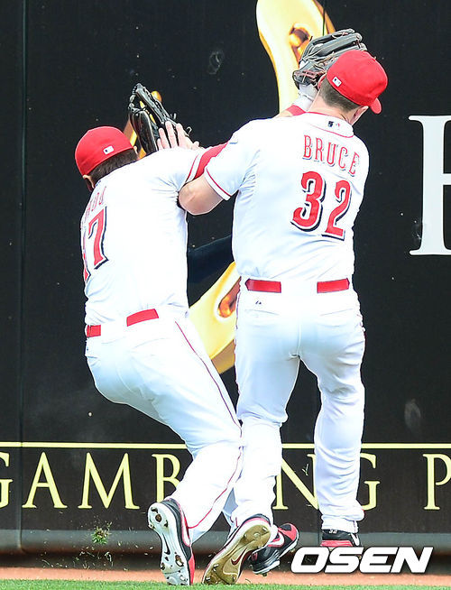 26일 새벽(이하 한국시간) 미국 오하이오주 신시내티 그레이트 아메리칸 볼파크에서 열린 신시내티 레즈와 시카고 컵스의 경기 2회초 무사 1루 카스티요의 뜬공을 추신수가 잡으면서 브루스와 충돌하고 있다.