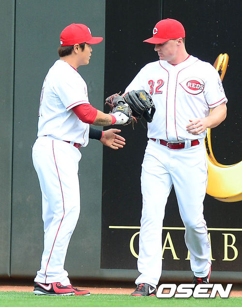 26일 새벽(이하 한국시간) 미국 오하이오주 신시내티 그레이트 아메리칸 볼파크에서 열린 신시내티 레즈와 시카고 컵스의 경기 2회초 무사 1루, 추신수가 카스티요의 뜬공을 잡으면서 브루스와 충돌 후 브루스의 상태를 살피고 있다.