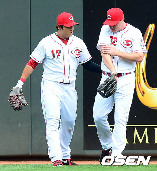 26일 새벽(이하 한국시간) 미국 오하이오주 신시내티 그레이트 아메리칸 볼파크에서 열린 신시내티 레즈와 시카고 컵스의 경기 2회초 무사 1루, 추신수가 카스티요의 뜬공을 잡으면서 브루스와 충돌 후 브루스의 상태를 살피고 있다.