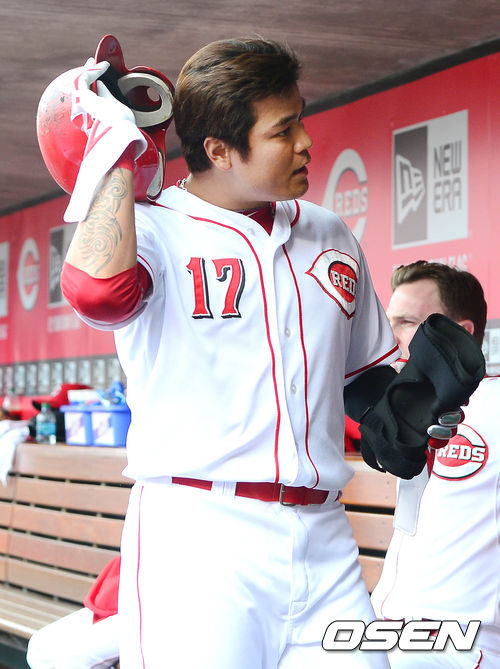 26일 새벽(이하 한국시간) 미국 오하이오주 신시내티 그레이트 아메리칸 볼파크에서 열린 신시내티 레즈와 시카고 컵스의 경기 1회말 선두타자 추신수가 플라이아웃으로 물러난 후 덕아웃으로 들어오고 있다.