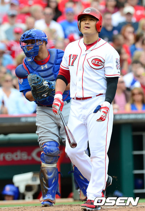 26일 새벽(이하 한국시간) 미국 오하이오주 신시내티 그레이트 아메리칸 볼파크에서 열린 신시내티 레즈와 시카고 컵스의 경기 3회말 1사 1,2루 추신수가 헛스윙 삼진 후 덕아웃으로 향하고 있다.