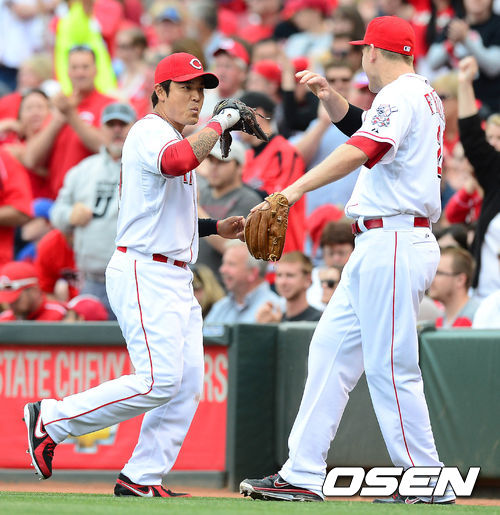 26일 새벽(이하 한국시간) 미국 오하이오주 신시내티 그레이트 아메리칸 볼파크에서 열린 신시내티 레즈와 시카고 컵스의 경기 5회초 2사 리조를 보살로 아웃 시킨 후 추신수가 덕아웃으로 향하며 프레이저와 하이파이브를 하고 있다.
