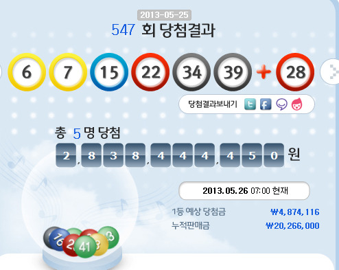이번 주에는 1등 당첨자가 5명에 불과해 당첨금 액수가 적지않다. 547회 1등 당첨자 5명은 각자 28억 3844만 4550원의 거액을 수령하게 된다.