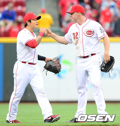 26일 새벽(이하 한국시간) 미국 오하이오주 신시내티 그레이트 아메리칸 볼파크에서 열린 신시내티 레즈와 시카고 컵스의 경기 종료 후 추신수가 브루스와 하이파이브를 하고 있다.
