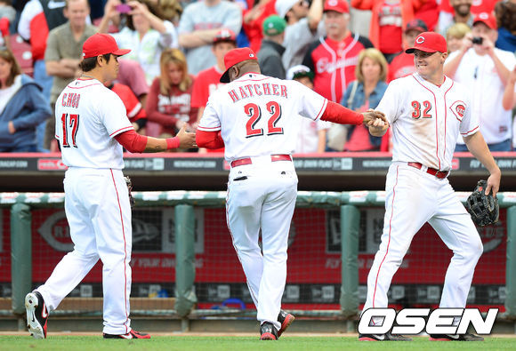 26일 새벽(이하 한국시간) 미국 오하이오주 신시내티 그레이트 아메리칸 볼파크에서 열린 신시내티 레즈와 시카고 컵스의 경기 종료 후 추신수와 브루스(오른쪽)가 해처 코치와 악수를 나누고 있다.