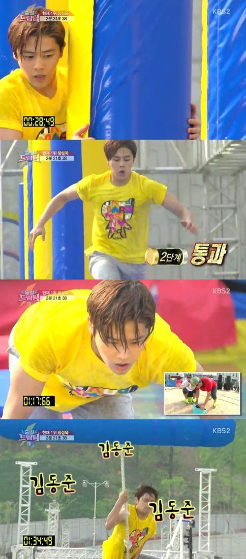 김동준 26일 오전 방송된 KBS 2TV '출발드림팀 시즌2'(이하 '드림팀2')에서 국가대표 태권도 시범단에 맞설 드림팀의 여섯 번 째 주자로 나서 종합 장애물 5종 경기에 도전했다.