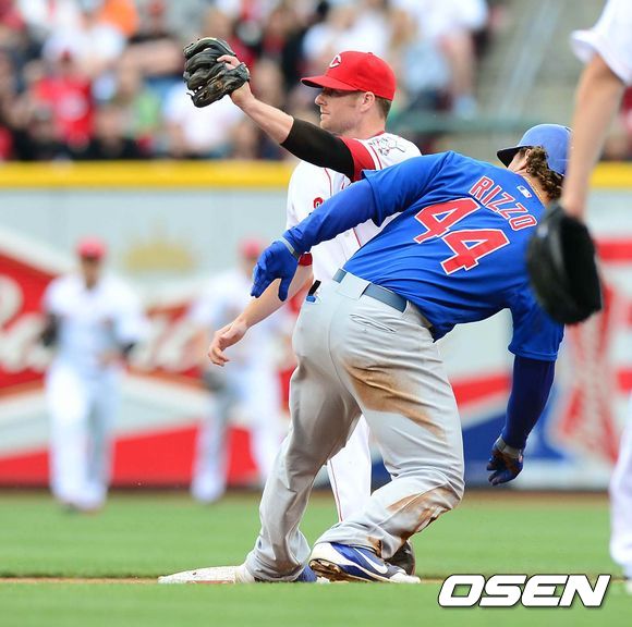 26일 새벽(이하 한국시간) 미국 오하이오주 신시내티 그레이트 아메리칸 볼파크에서 열린 신시내티 레즈와 시카고 컵스의 경기 5회초 2사 추신수의 명품 송구로 리조가 2루에서 아웃되고 있다. 추신수는 시즌 2호 보살을 기록했다.