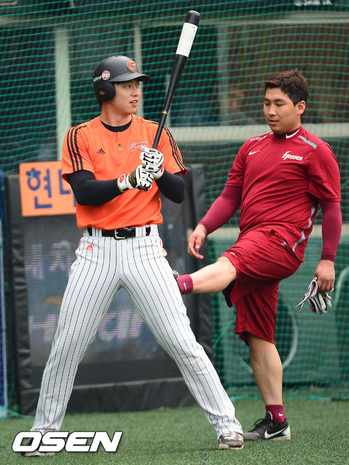 26일 오후 서울 목동구장에서 2013 한국야쿠르트 세븐프로야구 넥센 히어로즈와 롯데 자이언츠의 경기가 열릴 예정인 가운데 양팀 훈련 시간에 롯데 김대우 뒤에서 넥센 허도환 포수가 엉덩이를 차고 있다.