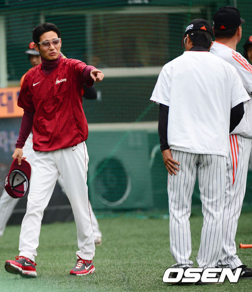 26일 오후 서울 목동구장에서 2013 한국야쿠르트 세븐프로야구 넥센 히어로즈와 롯데 자이언츠의 경기가 열릴 예정인 가운데 양팀 훈련 시간에 넥센 염경엽 감독이 롯데 코치진과 즐겁게 얘기를 나누고 있다.