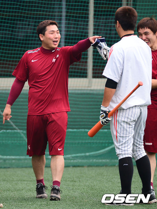 26일 오후 서울 목동구장에서 2013 한국야쿠르트 세븐프로야구 넥센 히어로즈와 롯데 자이언츠의 경기가 열릴 예정인 가운데 양팀 훈련 시간에 넥센 허도환과 롯데 강민호가 즐겁게 얘기를 나누고 있다.