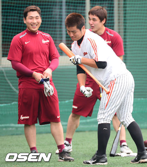 26일 오후 서울 목동구장에서 2013 한국야쿠르트 세븐프로야구 넥센 히어로즈와 롯데 자이언츠의 경기가 열릴 예정인 가운데 양팀 훈련 시간에 넥센 허도환과 롯데 강민호가 즐겁게 얘기를 나누고 있다.
