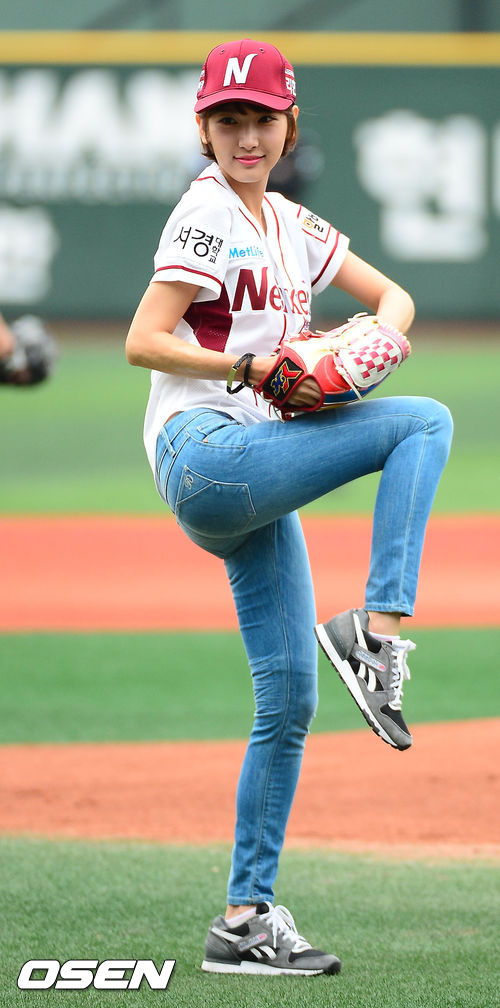 26일 오후 서울 목동구장에서 2013 한국야쿠르트 세븐프로야구 넥센 히어로즈와 롯데 자이언츠의 경기가 열릴 예정인 가운데, 탤런트 이해인이 승리 기원 시구를 하고 있다.