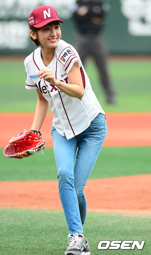 26일 오후 서울 목동구장에서 2013 한국야쿠르트 세븐프로야구 넥센 히어로즈와 롯데 자이언츠의 경기가 열릴 예정인 가운데, 탤런트 이해인이 승리 기원 시구를 하고 있다.