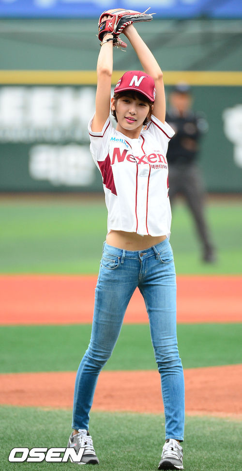 26일 오후 서울 목동구장에서 2013 한국야쿠르트 세븐프로야구 넥센 히어로즈와 롯데 자이언츠의 경기가 열릴 예정인 가운데, 탤런트 이해인이 승리 기원 시구를 하고 있다.