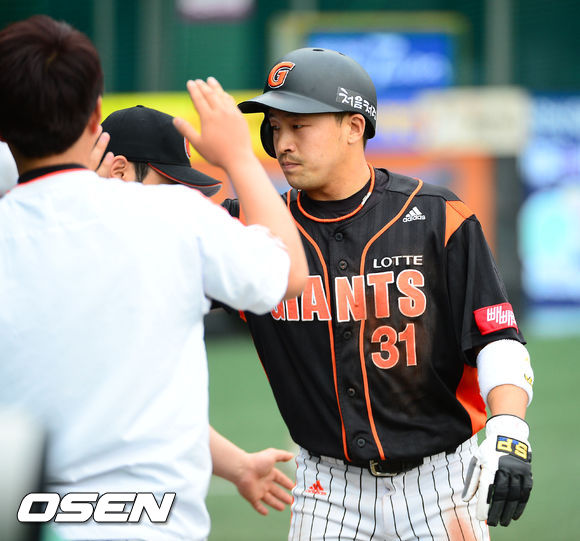 26일 오후 서울 목동구장에서 열린 2013 한국야쿠르트 세븐프로야구 넥센 히어로즈와 롯데 자이언츠의 경기, 1회초 2사 주자 2루 롯데 강민호의 우익수 앞 선취 1타점 적시타때 홈을 밟은 손아섭이 덕아웃에서 동료들과 하이파이브를 하고 있다.