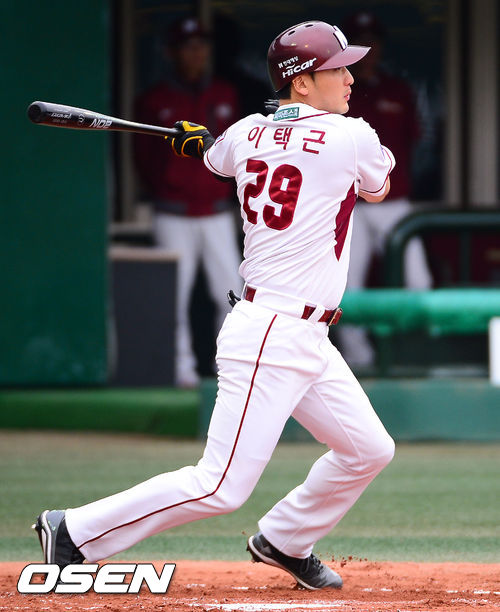 26일 오후 서울 목동구장에서 열린 2013 한국야쿠르트 세븐프로야구 넥센 히어로즈와 롯데 자이언츠의 경기, 1회말 1사 주자 2루 넥센 이택근이 동점 1타점 적시타를 날리고 있다.