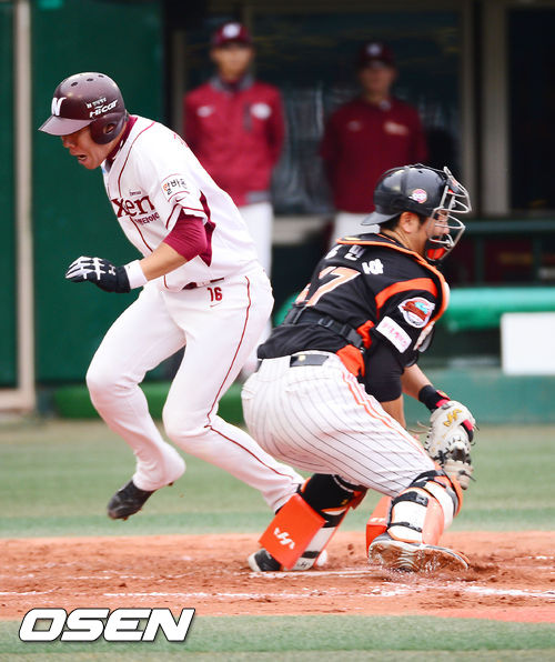 26일 오후 서울 목동구장에서 열린 2013 한국야쿠르트 세븐프로야구 넥센 히어로즈와 롯데 자이언츠의 경기, 1회말 2사 주자 1,2루 넥센 오윤의 중견수 앞 1루타때 강정호가 홈 플레이트 위에 있는 강민호의 발을 밟으며 홈으로 들어오고 있다.