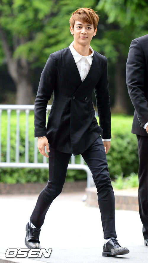 결혼식에 참석한 샤이니 멤버 민호가 포토월로 입장하고 있다.