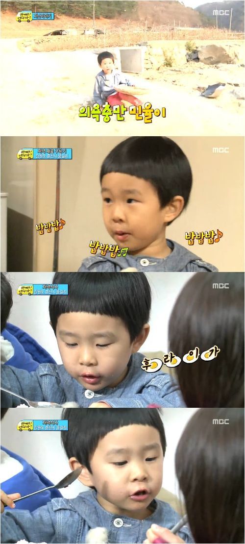 김민율은 배고픈 나머지 동네 이장에게 “밥 주세요. 밥밥밥”이라면서 밥타령을 했다. 투정마저도 노래로 승화한 것. 또한 계란후라이를 먹으며 “후라이 후라이. 후라이가 맛있다. 후라이가 점프하네”라고 올챙이송을 개사한 노래를 불렀다.