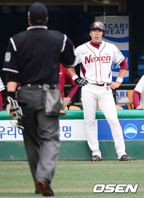 26일 오후 서울 목동구장에서 열린 2013 한국야쿠르트 세븐프로야구 넥센 히어로즈와 롯데 자이언츠의 경기, 1회말 2사 주자 1,2루 넥센 오윤의 중견수 앞 1루타때 강정호가 홈 플레이트 위에 있는 강민호의 발을 밟으며 홈으로 들어왔다. 이에 김정국 구심이 아웃 판정을 하자 넥센 강정호가 항의하고 있다.