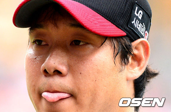 26일 오후 서울 잠실야구장에서 열린 '2013 한국야쿠르트 세븐 프로야구' LG 트윈스와 SK 와이번스의 경기, 3회초 2사 1,3루에서 LG 류제국이 SK 박정권을 스트라이크 낫아웃 삼진을 잡아내고 더그아웃으로 향하고 있다.