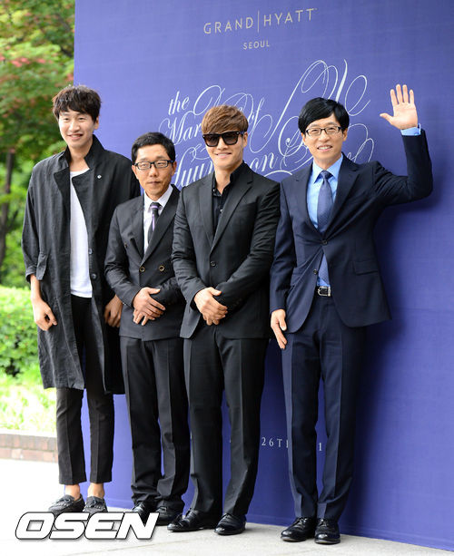 결혼식에 참석한 이광수 김제동 김종국 유재석이 포토타임을 갖고 있다.