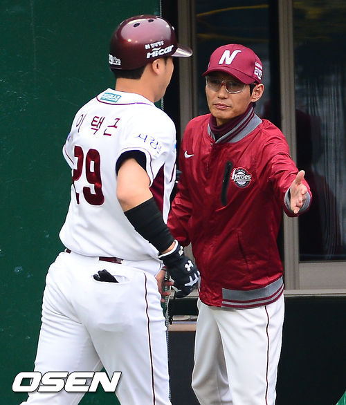 26일 오후 서울 목동구장에서 열린 2013 한국야쿠르트 세븐프로야구 넥센 히어로즈와 롯데 자이언츠의 경기, 1회말 2사 주자 3루 넥센 강정호의 역전 1타점 적시타때 홈을 밟은 이택근과 염경엽 감독이 하이파이브를 하고 있다.