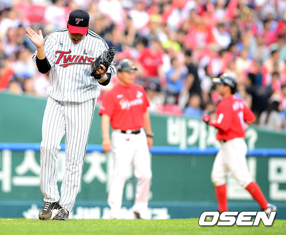 26일 오후 서울 잠실야구장에서 열린 '2013 한국야쿠르트 세븐 프로야구' LG 트윈스와 SK 와이번스의 경기, 4회초 2사 1,2루에서 LG 류제국이 SK 조인성을 3루수 땅볼 병살로 처리하며 기뻐하고 있다.