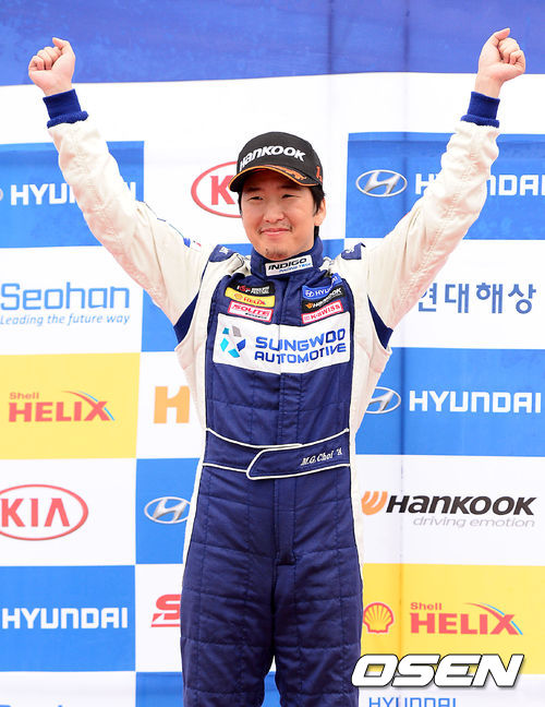 26일 전라남도 영암 코리아인터내셔널서킷에서 진행된 '2013 코리아 스피드 페스티벌(이하 KSF)' 2라운드 시상식에서 제네시스쿠페 챔피언십 클래스10 1위를 차지한 쏠라이트인디고 레이싱팀 최명길이 세리머니를 펼치고 있다.