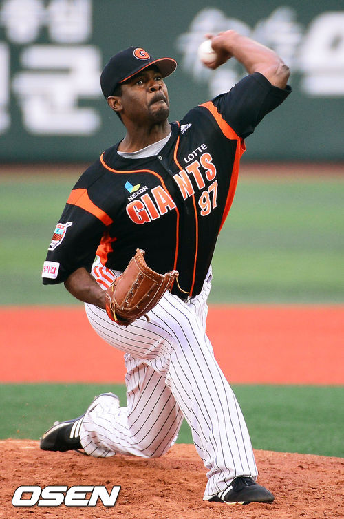 26일 오후 서울 목동구장에서 열린 2013 한국야쿠르트 세븐프로야구 넥센 히어로즈와 롯데 자이언츠의 경기, 롯데 선발 유먼이 힘차게 공을 뿌리고 있다.