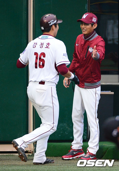 26일 오후 서울 목동구장에서 열린 2013 한국야쿠르트 세븐프로야구 넥센 히어로즈와 롯데 자이언츠의 경기, 4회말 1사 주자 1,2루 넥센 유한준의 좌익수 앞 1타점 적시타때 홈을 밟은 넥센 강정호가 염경엽 감독과 하이파이브를 하고 있다.