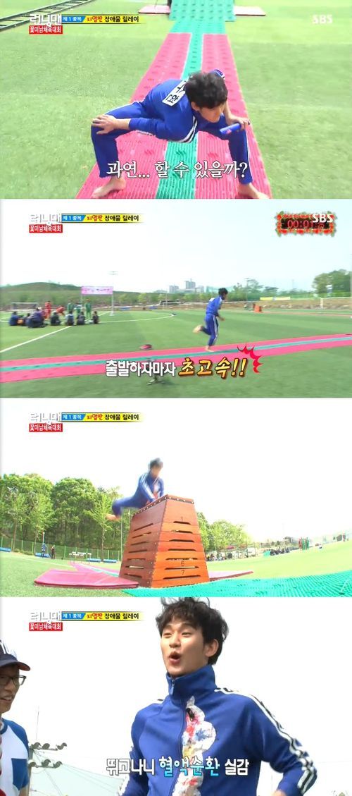 이날 유재석, 이광수와 한 팀이 된 김수현이 첫 번째 미션인 지압판 장애물 릴레이를 60초 안에 수행하기 위해 첫 번째 구간인 허들과 뜀틀 넘기를 담당했다.