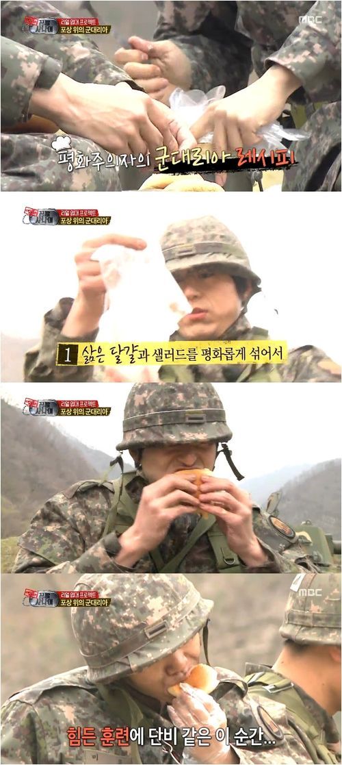 배우 류수영이 ‘진짜사나이’에서 에그샐러드를 넣은 특제 ‘군대리아’를 만들어서 먹었다.