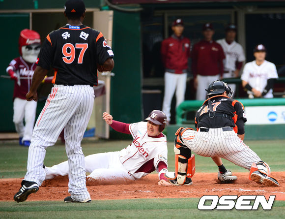 26일 오후 서울 목동구장에서 열린 2013 한국야쿠르트 세븐프로야구 넥센 히어로즈와 롯데 자이언츠의 경기, 4회말 1사 주자 만루 넥센 김민우의 좌익수 오른쪽 2타점 적시타때 유한준이 홈으로 몸을 날리며 세이프되고 있다.