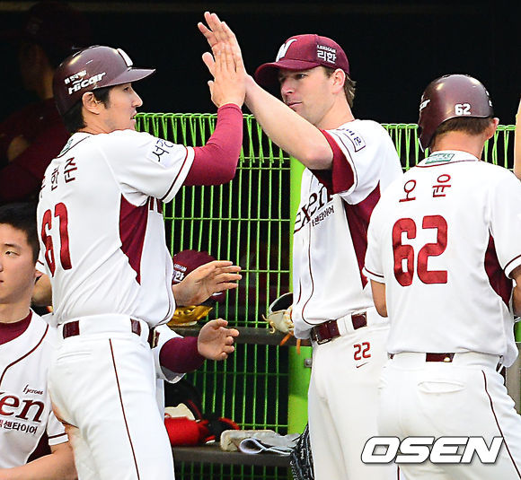 26일 오후 서울 목동구장에서 열린 2013 한국야쿠르트 세븐프로야구 넥센 히어로즈와 롯데 자이언츠의 경기, 4회말 1사 주자 만루 넥센 김민우의 좌익수 오른쪽 2타점 적시타때 홈을 밟은 오윤과 유한준이 덕아웃에서 밴헤켄과 하이파이브를 하고 있다.