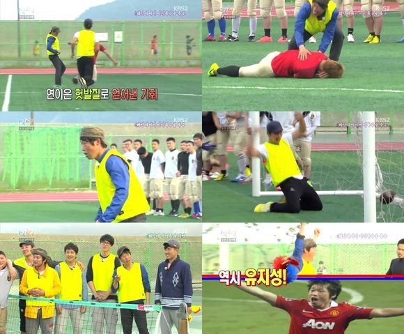 유해진은 26일 방송된 KBS 2TV '해피선데이-1박2일'에서 부산 우정 여행 도중 해양대 미식축구부를 상대로 세 가지 게임을 벌여 승패에 따라 저녁 대접을 하기로 약속했다.