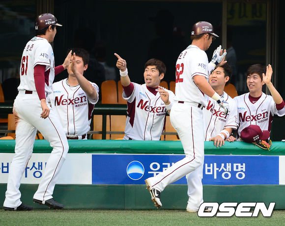 26일 오후 서울 목동구장에서 열린 2013 한국야쿠르트 세븐프로야구 넥센 히어로즈와 롯데 자이언츠의 경기, 4회말 1사 주자 만루 넥센 김민우의 좌익수 오른쪽 2타점 적시타때 홈을 밟은 오윤과 유한준이 덕아웃에서 동료들과 하이파이브를 하고 있다.