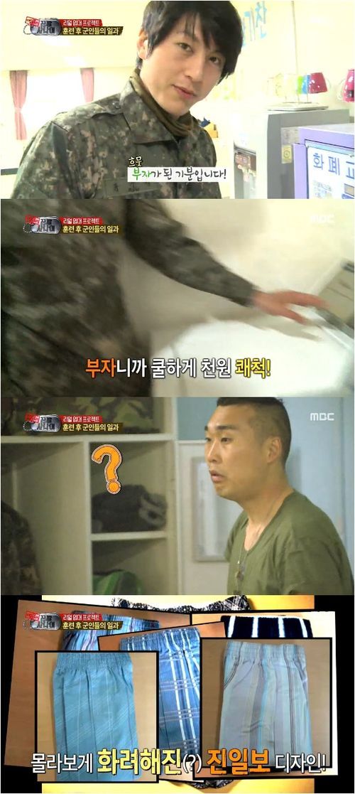 동전 세타기 뿐만 아니다. 과거 어두침침한 삼각팬티만 있었던 군대. 이제는 다섯종류의 사각 군대 팬티가 있었다. 이날 서경석과 손진영은 카메라가 있는데도 바지를 훌렁훌렁 벗어 서로 다른 군대 팬티를 부러워했다. 제작진은 두 사람의 아저씨 같은 모습으로 재미를 뽑아내는 한편, 요즘 군대 팬티가 착용감과 흡수력이 뛰어나다는 홍보도 잊지 않았다.