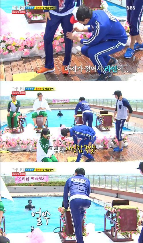 유재석이 물에 쫄딱 젖어 나와 옷이 몸에 붙어있자 김수현이 유재석의 다리에 붙어 옷을 떼어줬다. 이에 유재석은 자신의 다리 라인과 뒤태를 뽐냈다.
