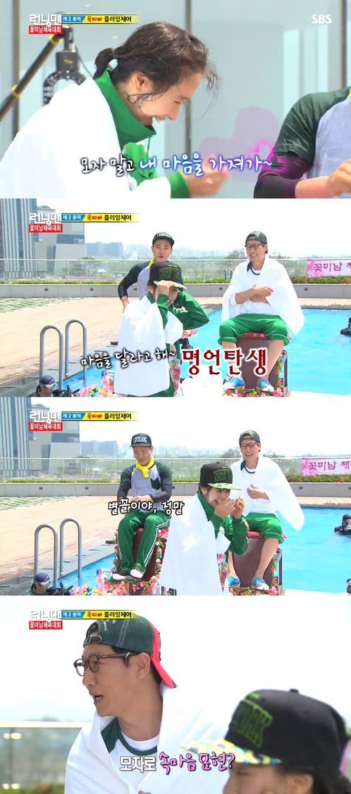 이날 멤버들은 두 번째 미션으로 묵찌빠 플라잉체어를 수행했다. 송지효와 개리는 플라잉체어 벌칙으로 물에 빠진 후 수영장에서 나왔다. 그때 두 사람은 모자가 바뀌었다.