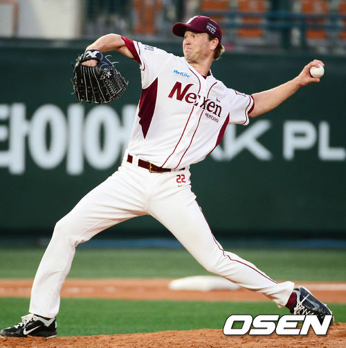 26일 오후 서울 목동구장에서 열린 2013 한국야쿠르트 세븐프로야구 넥센 히어로즈와 롯데 자이언츠의 경기, 6회 넥센 선발 밴헤켄이 힘차게 공을 뿌리고 있다.