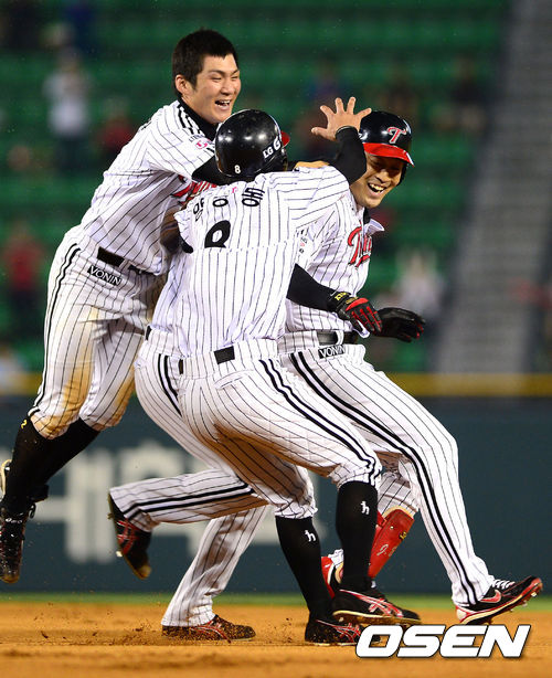 9회말 무사 1루에서 LG 정의윤이 끝내기 안타를 날리고 동료선수들의 축하를 받고 있다. /jpnews@osen.co.kr
