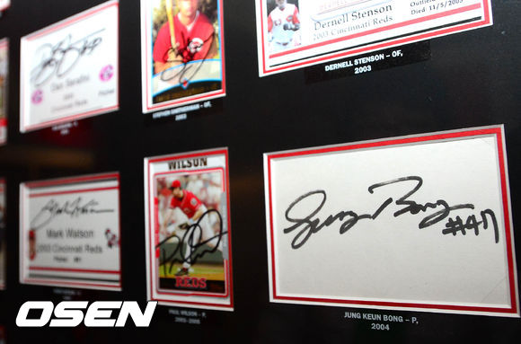 27일 새벽(이하 한국시간) 미국 오하이오주 신시내티 그레이트 아메리칸 볼파크에서 추신수가 선발출장하는 신시내티 레즈와 시카고 컵스의 경기가 열린다. 사진은 신시내티 레즈 구장에 전시되어있는 봉중근의 사인.