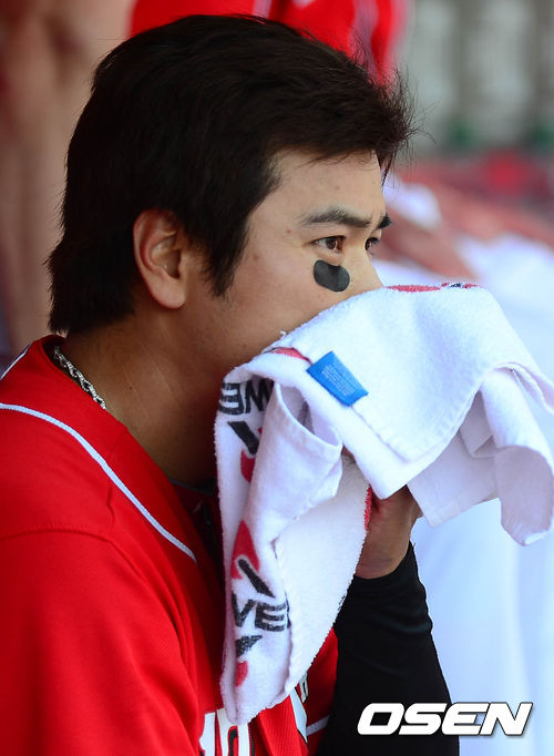 27일 새벽(이하 한국시간) 미국 오하이오주 신시내티 그레이트 아메리칸 볼파크에서 열린 신시내티 레즈와 시카고 컵스의 경기 1회말 선두타자 추신수가 삼진으로 물러난 후 덕아웃에서 땀을 닦고 있다.