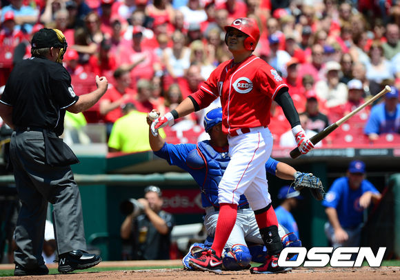 27일 새벽(이하 한국시간) 미국 오하이오주 신시내티 그레이트 아메리칸 볼파크에서 열린 신시내티 레즈와 시카고 컵스의 경기 1회말 추신수가 삼진으로 물러나고 있다.